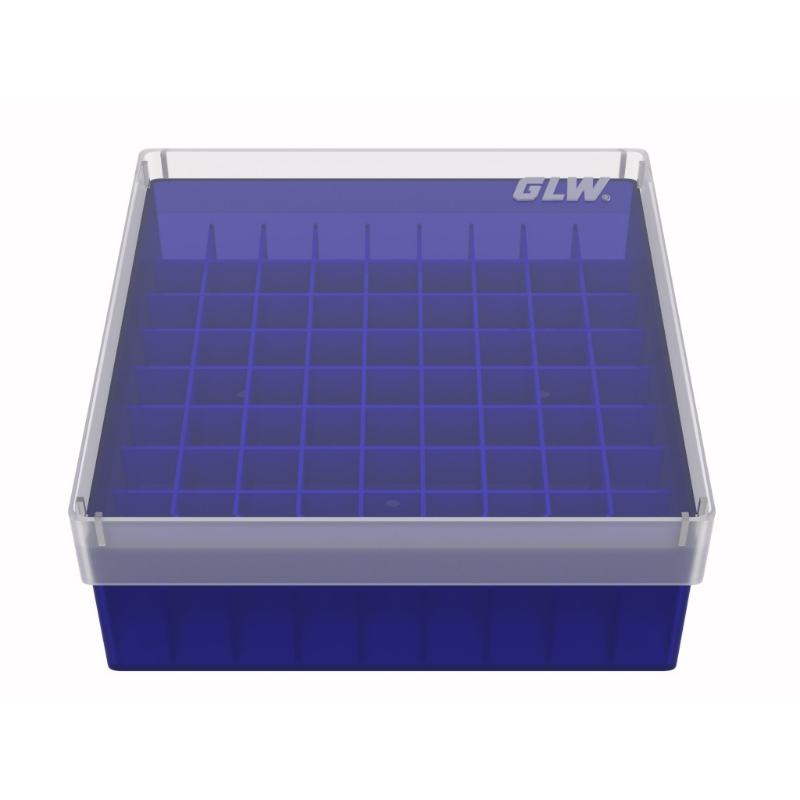 GLW Cryo Box with 9x9 compartments, made of polypropylene, autoclavable up to +121°C and use in freezer down to -90°C. The height of the box 52 mm is fix. The 9x9 compartments of our cryo boxes are ideal for tubes with 12.5 mm diameter. Here you can keep up to 81 Cryo-Tubes, Test-Tubes 1.5 – 2 ml, Sample-Vials 2 ml. A clear lid offers a view of the contents without opening the cryo-box. Drainage holes in base for easy opening the box at low temperatures. The perfect support for storing, transporting, freezing and autoclaving your tubes.