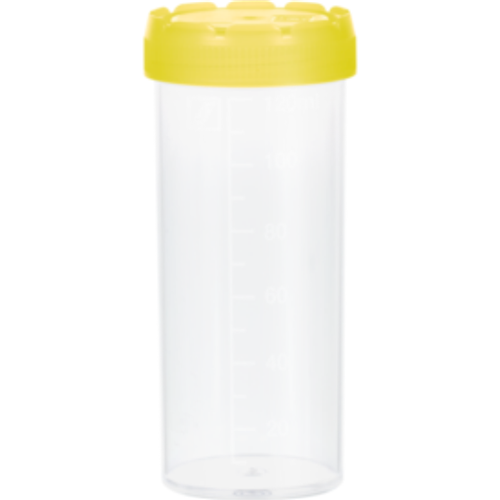 Container 120 ml, 105 x 44 mm, flat base, PP, with moulded graduation, with assembled PE cap, STERILE / PK 250