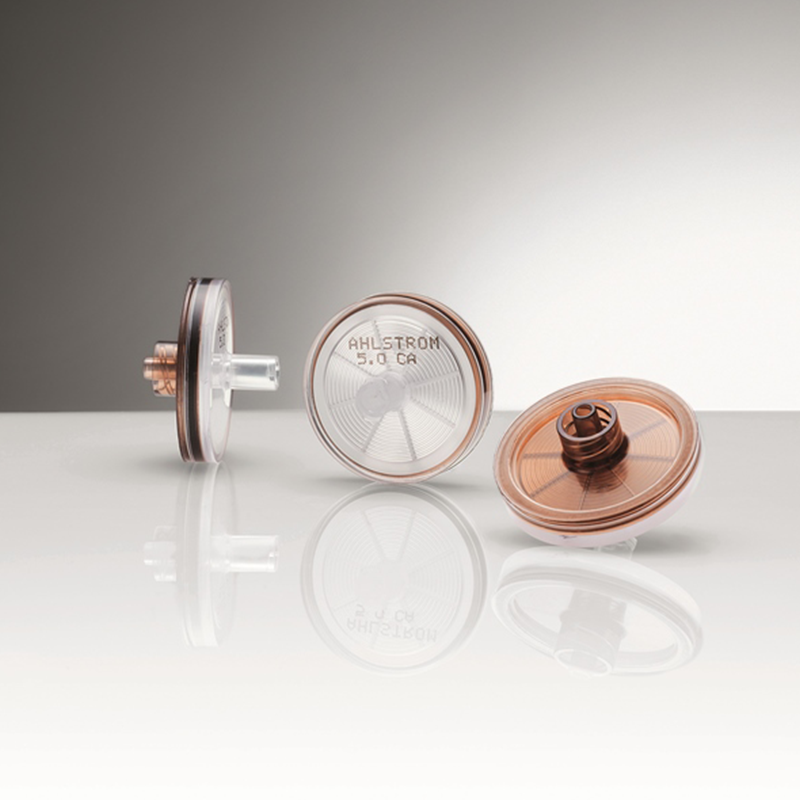 Ahlstrom offers a wide variety of syringe filters for convenient sample preparation and fluid sterilization. Cellulose Acetate (CA) and Polyether Sulfone (PES) membranes are ideal for samples containing proteins and generally recommended for aqueous solutions filtration. Nylon (NY), PTFE and Regenerated Cellulose (RC) membranes are recommended for organic solvents filtration. Glass fiber prefilter and a cellulose acetate membrane are recommended for highly loaded aqueous solutions.