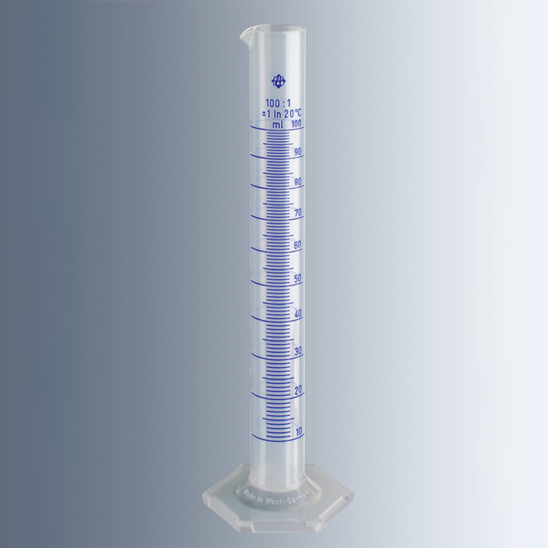Graduated cylinders, 500:5 ml, /- 2.5 ml, PP, cl.B, tall, spout, hex. base, blue / EA