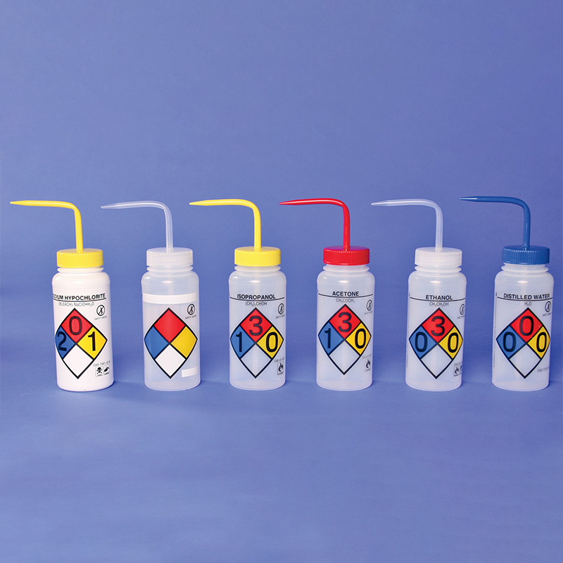 A unique valve prevents pressure build-up eliminating potentially dangerous chemical drips. They are pre-printed with the Chemical name and formula, the National Fire Protection Association (NFPA) Section 704 Four-color Diamond, health hazards, Chemical Abstract System (CAS) number, and suggested protective clothing and equipment.