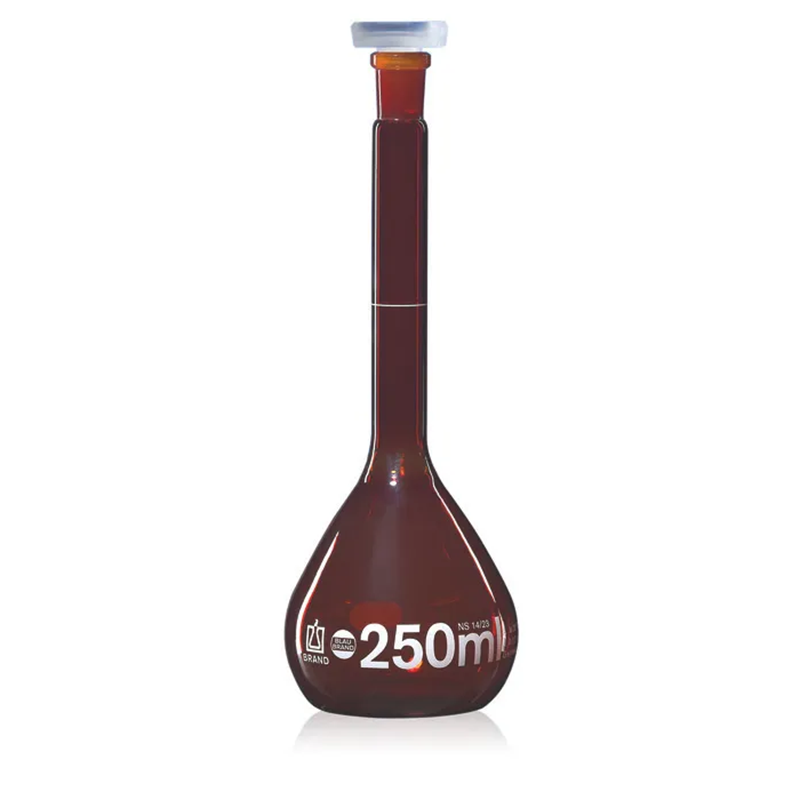 Vol. flask amber BLAUBRAND class A, 50ml, Boro 3.3, NS 14/23, PP-stopper/ EA