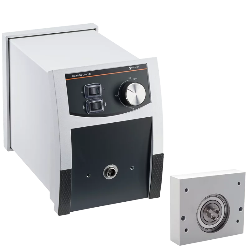 Depending on the adapted pump head, a flow rate of 0.83 - 861 ml/min for the single-channel and 0.005 - 364 ml/min for the multi-channel pump head is guaranteed. The Core 120 conveys with a control accuracy of ± 5% at a speed range of 10 - 120 rpm.