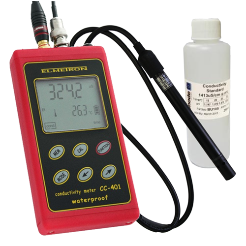 The conductivity meter CC-401 belongs to the newest generation of measuring devices. It offers wide range of additional functions. The meter ensures high accuracy and repeatability of the readings. Two kinds of power source: rechargeable battery and power adapter enable work in field and long-lasting measurements in the laboratory. The meter’s memory is independent from power supply. The meter is equipped with large backlit custom LCD display, enabling simultaneous observing of the measured function, temperature value and additional symbols which make working easier. Waterproof housing makes working in difficult conditions possible. Minimised size and weight make the meter very handy especially during the field work.